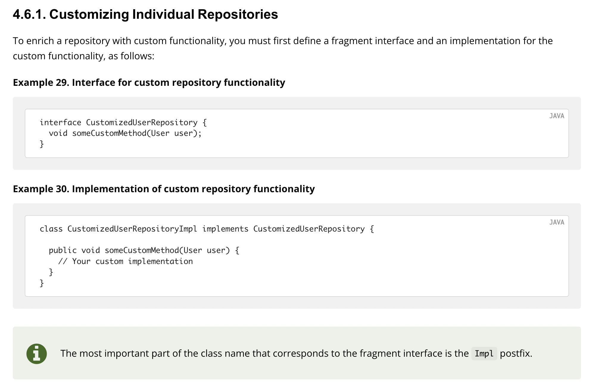 하지만 최근에는 MemberCustomRepositoryImpl 처럼 구현 대상 interface의 이름 끝에 Impl을 추가해줘도 된다.