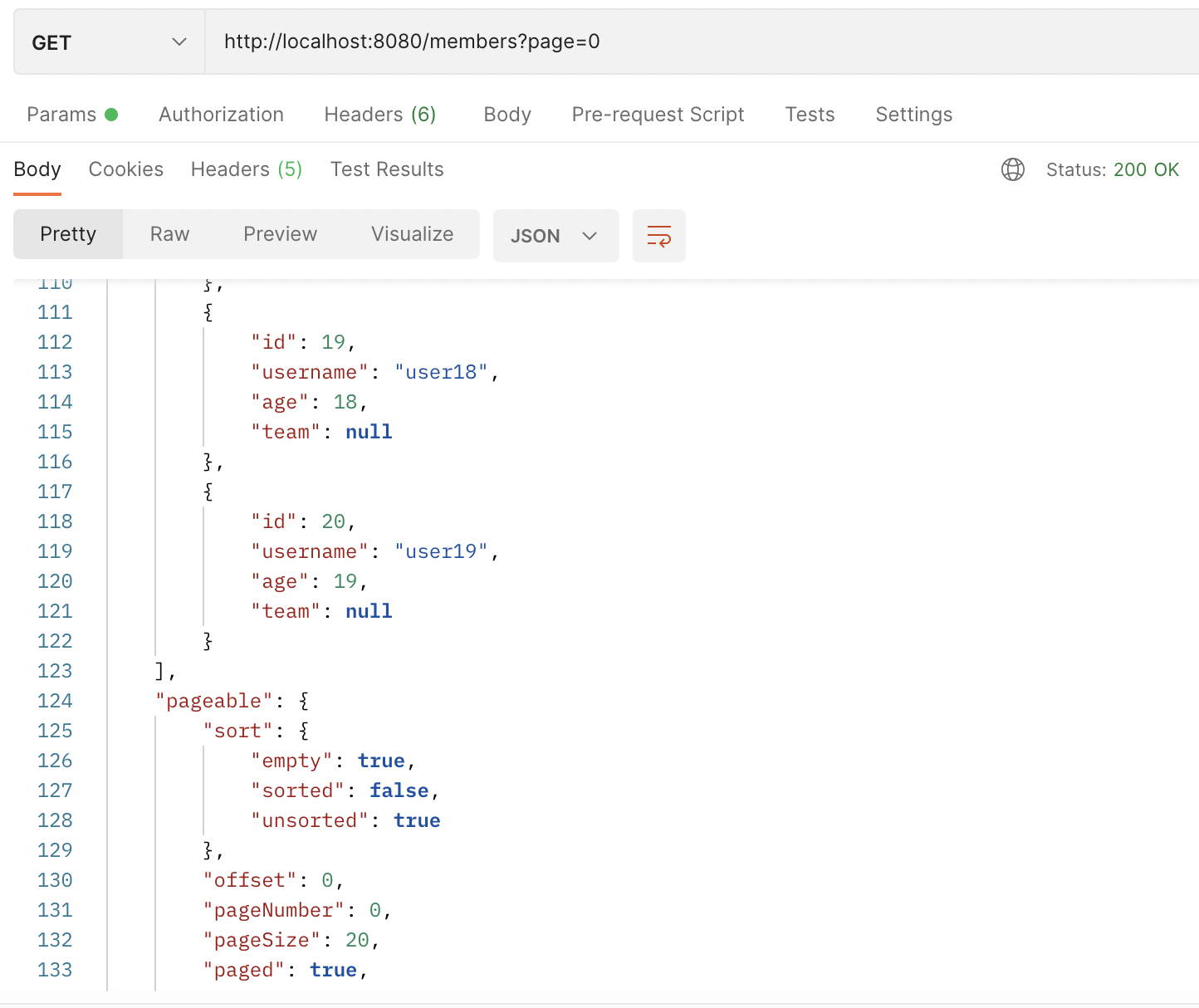0 page에 해당하는 20명의 member 정보가 출력되는 것 을 확인할수 있다.
