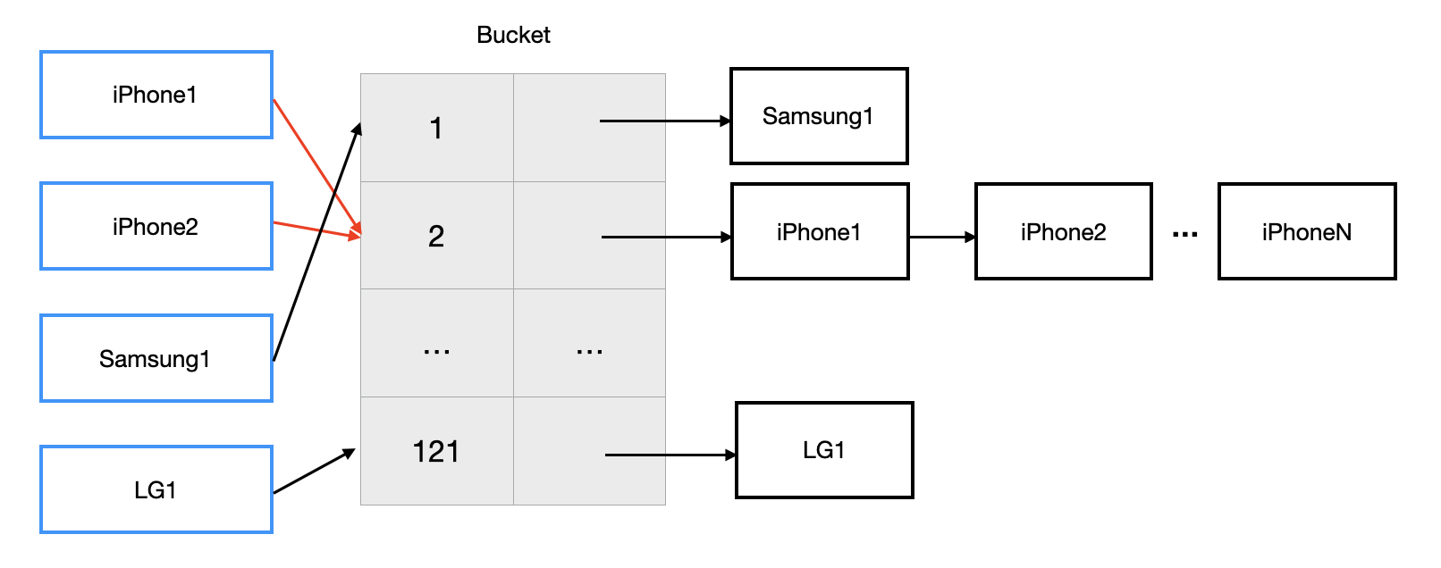 iPhone1, 2 같은 경우 동일한 Bucket을 가리키기 때문에 해당 Linked List에 뒤에 연속적으로 추가되어 저장되게 됩니다.