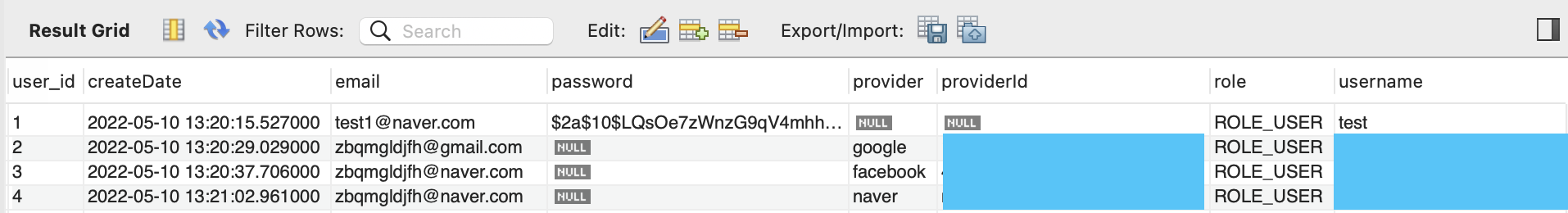 각각 email, google, facebook, naver 로 정상 로그인 되며, DB에는 다음과 같이 저장되게 된다.