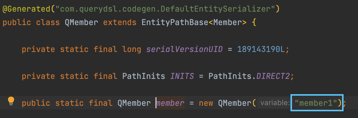 QMember m1 = new QMember("m1"); // m1이라는 별칭으로 직접 생성