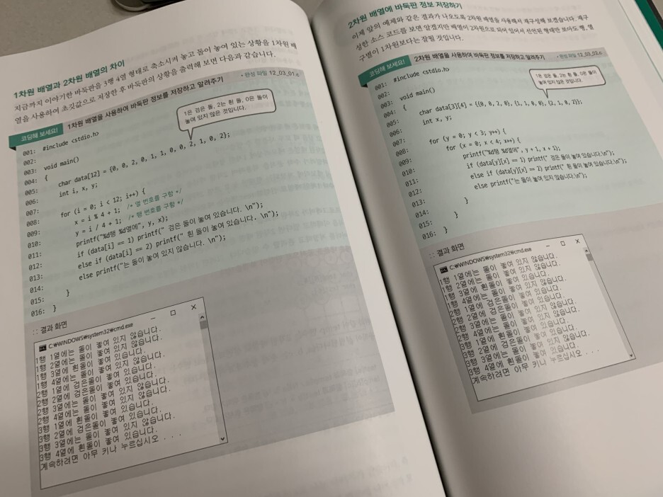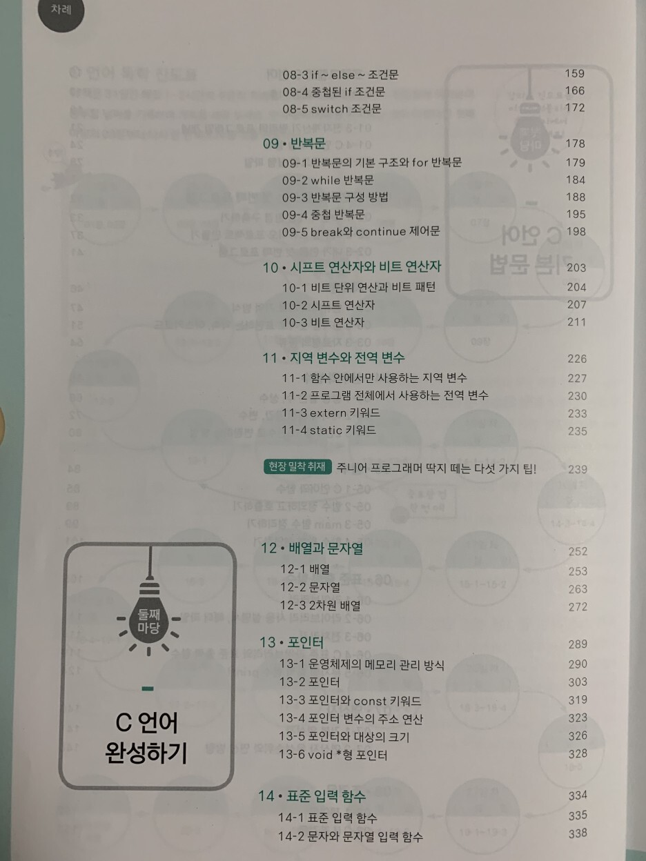 크게 두가지 마당으로 구성되어 있다. 첫째마당은 아주 기본적은 문법(ex. 반복문, 변수, 상수, 함수, 자료형 등등)을 다루고 있으며, 둘째마당에서부터 악명높은 포인터와 다차원배열, 동적할당, 구조체 등등 을 다루고 있다.