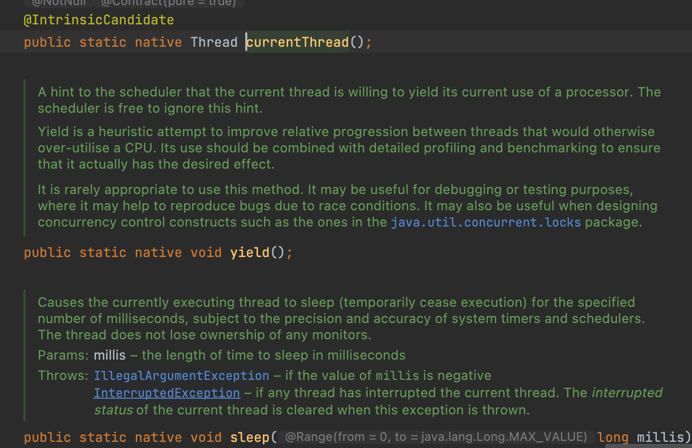 - Native Method 는 메서드에 Native 라는 키워드가 추가되어있고, 그 구현을 Java가 아닌, C++, C# 으로 구현한것을 말한다. 대표적으로 currentThread가 있다.