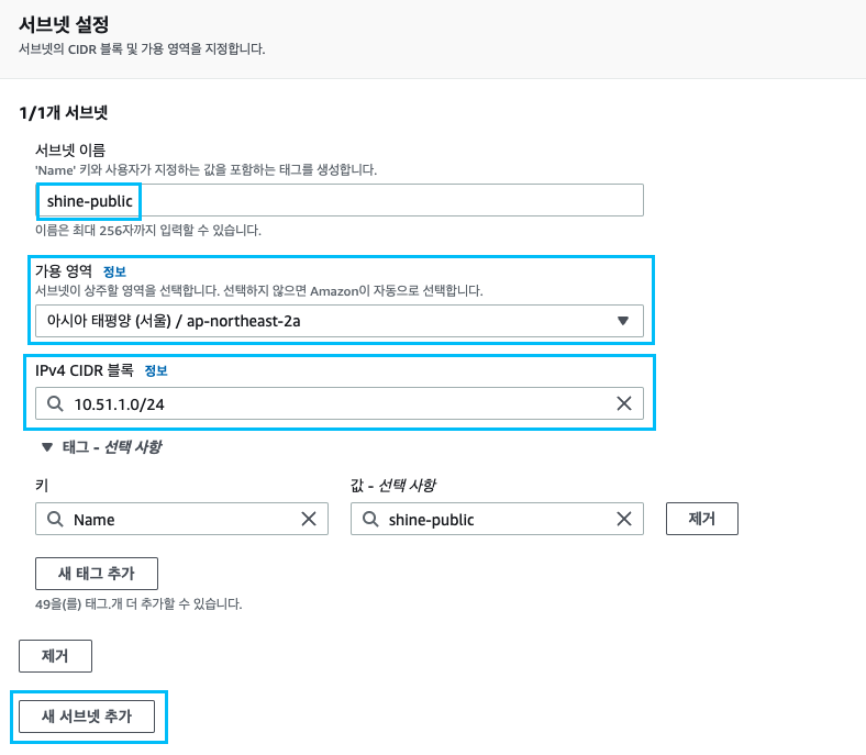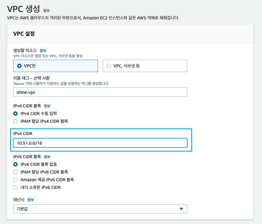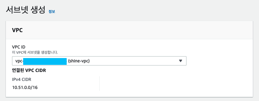 생성단계에서 VPC 를 선택해줘야 하는데, 직전에 만든 shine-vpc를 선택해 줍니다!