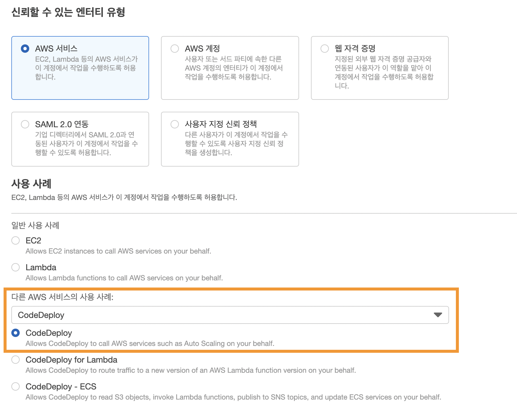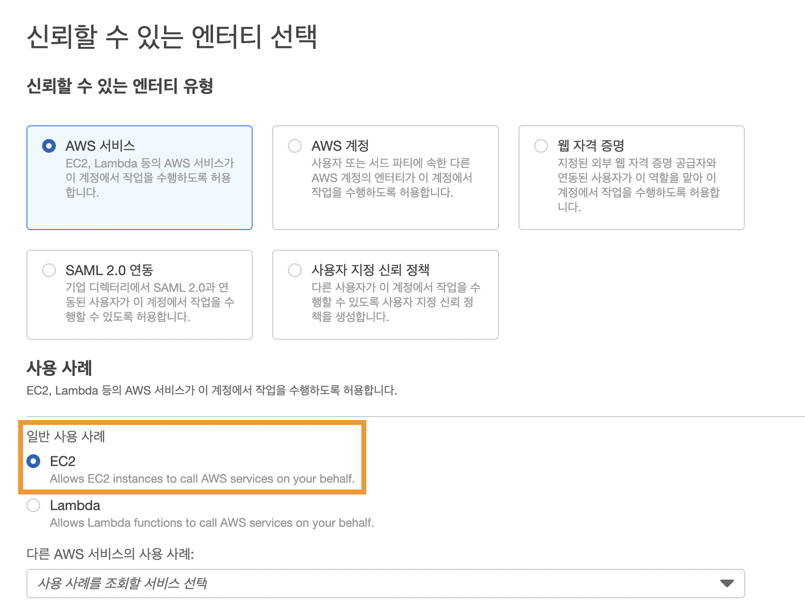 | AWS 서비스에만 할당할 수 있는 권한 | AWS 서비스 외에 사용할 수 있는 권한 |