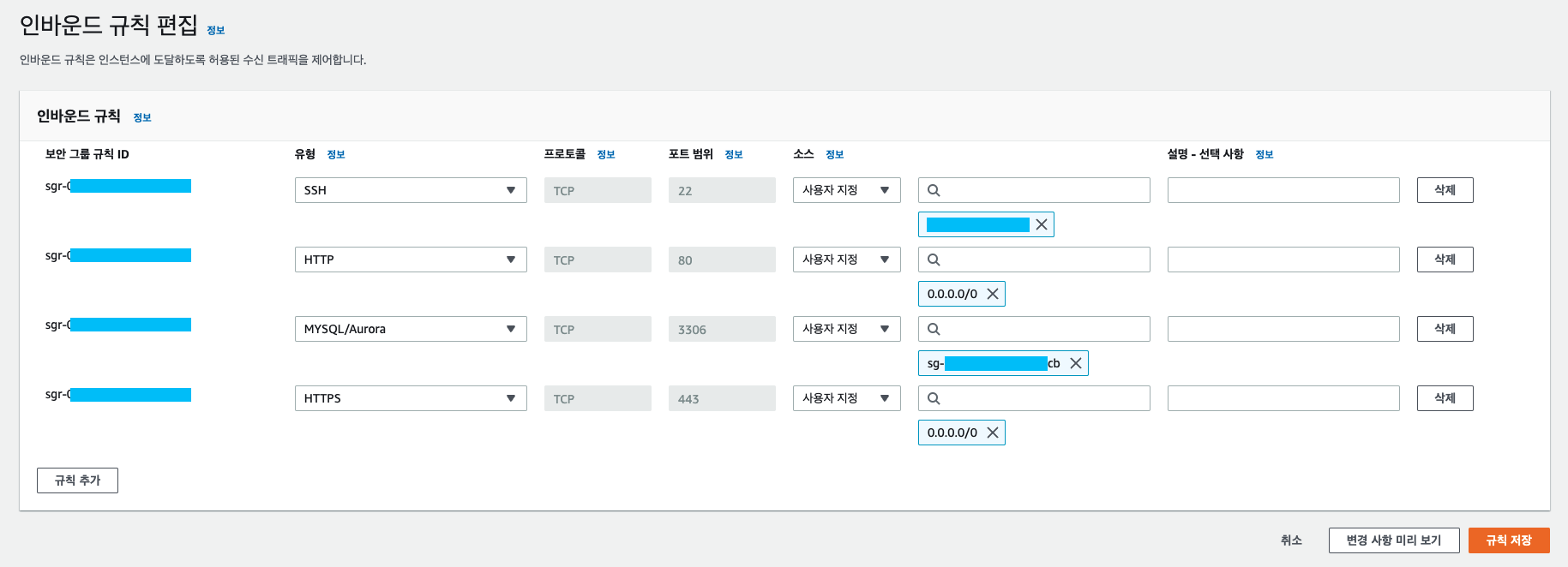 이후 EC2 -> 보안그룹 -> 인바운드 규칙 -> 인바운드 규칙 편집 에 들어가 다음과 같이 해주셔야 합니다.