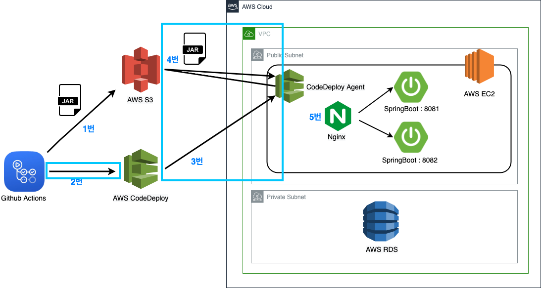 이번 글에서는 Github Actions에서 CodeDeploy에게 S3에 있는 jar 파일을 EC2로 가져가서 담당한 배포 그룹의 EC2에 배포하는 과정을 진행하게 됩니다.