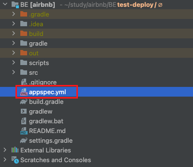 - 우리의 애플리케이션 최상단 경로에 AppSpec.yml이라는 yml파일을 추가합니다.