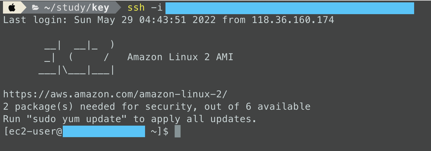 이후 발급받은 pem key를 이용하여 ssh로 접속하면 다음과 같이 성공적으로 접속할 수 있다.