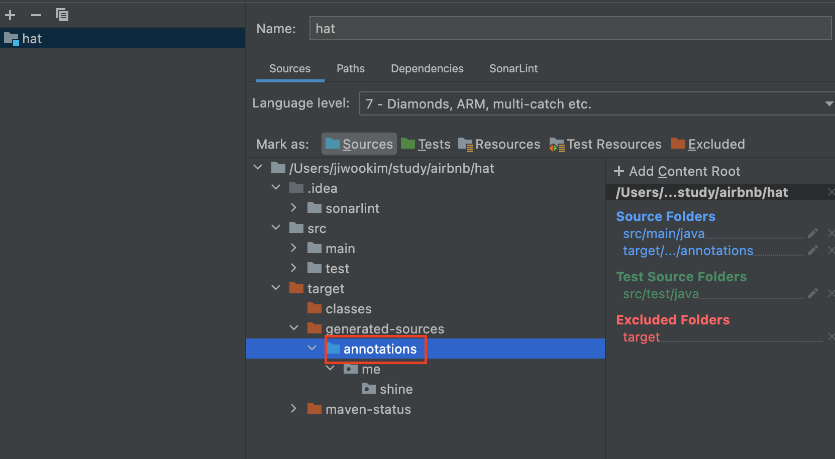 다음과 같이 annotations 디렉토리를 Sources 로 변경시켜주자.