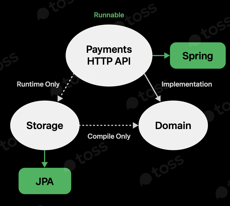또한 Storage 모듈 자체를 은닉할 수 있는데, API가 Storage 모듈을 Runtime에 의존하게 하고, Storage 모듈은 Domain모듈의 명세를 따라 구현체의 역할만 하는 구조로 수정할 수 있습니다.