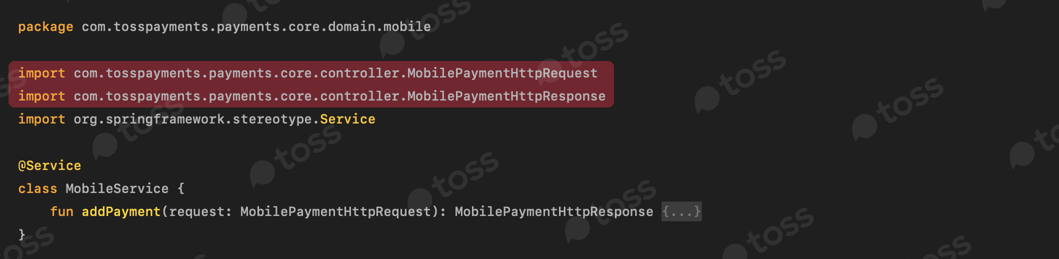 아까 위에서 언급한 Layer 규칙중 '레이어는 역방향으로 참조하면 안된다' 라는 규칙이 있었는데, 이에 위반되는 코드 입니다.