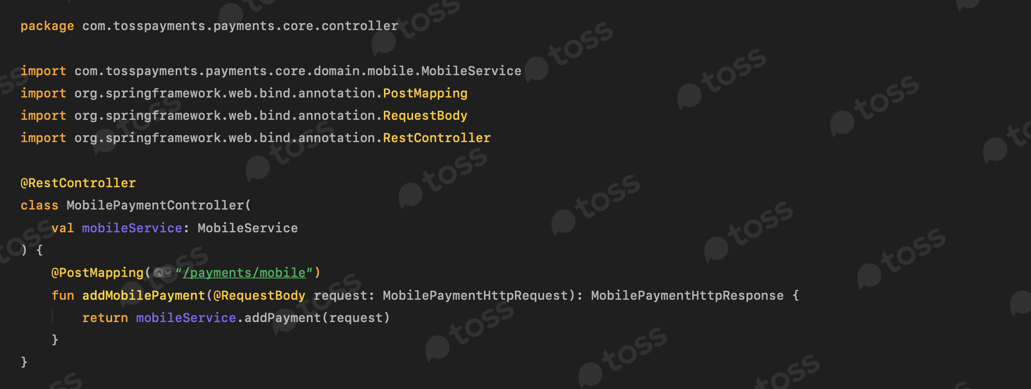 또한 MobilePaymentHttpRequest는 import가 되어있지 않은것으로 미루어 보아 같은 package안에 있을것 입니다.
