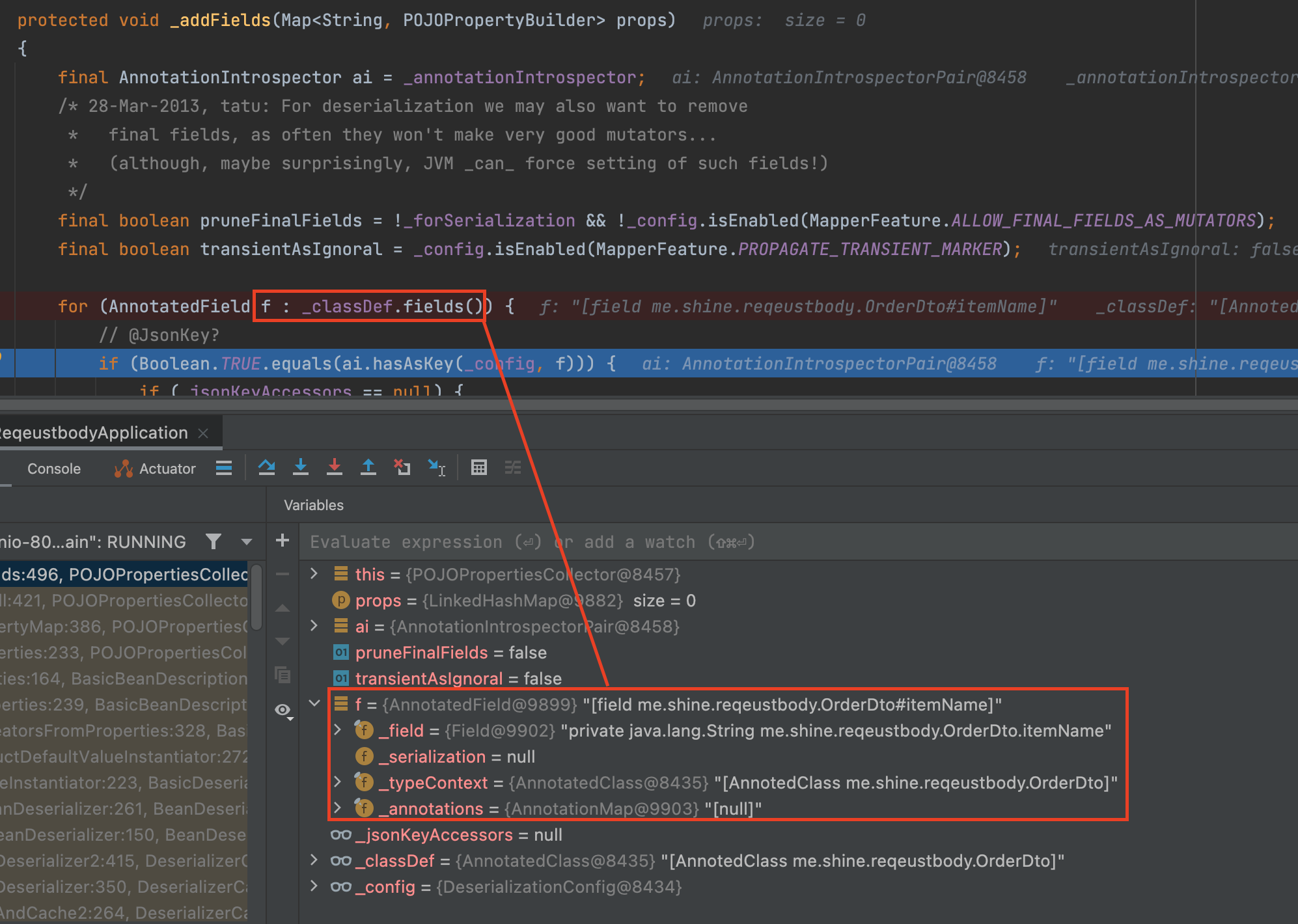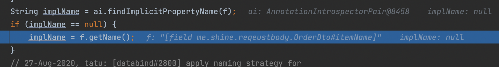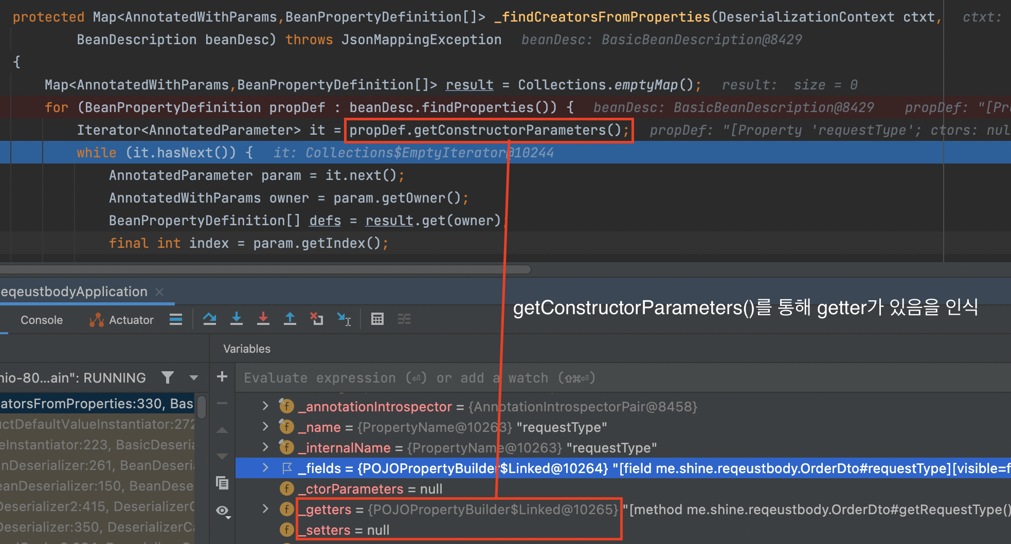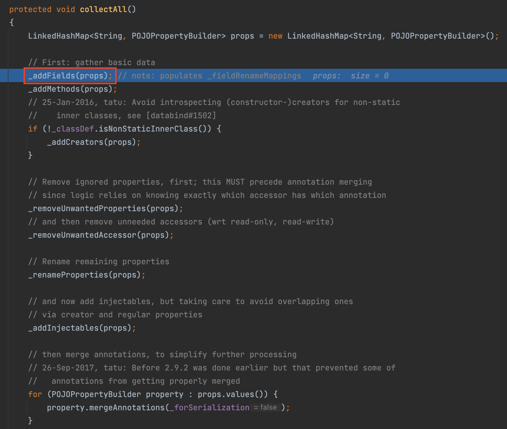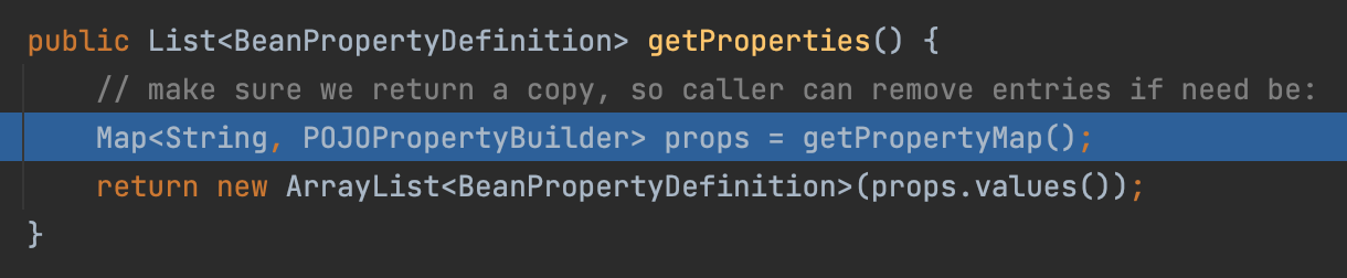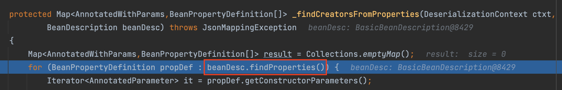 다음 코드 부분을 보면 beanDesc.findProperties()를 호출하고 있는데, 해당 메서드에서 field의 이름들을 알아오게 됩니다.