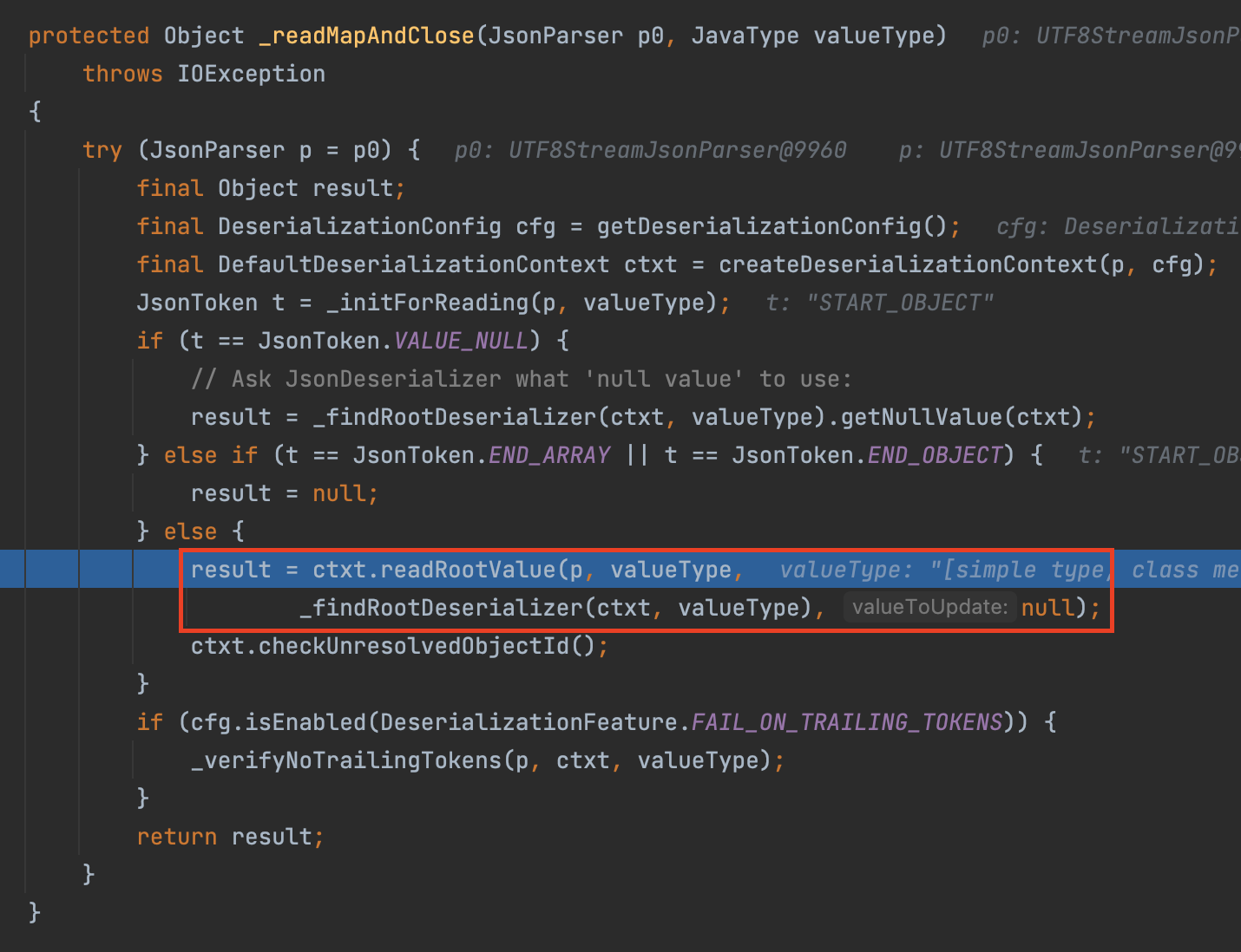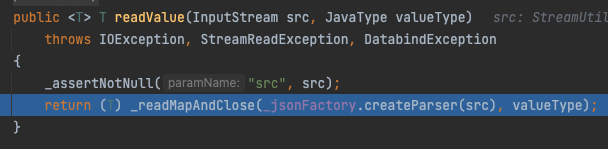 이후 readValue 내부의 _readMapAndClose 를 호출하게 됩니다.
