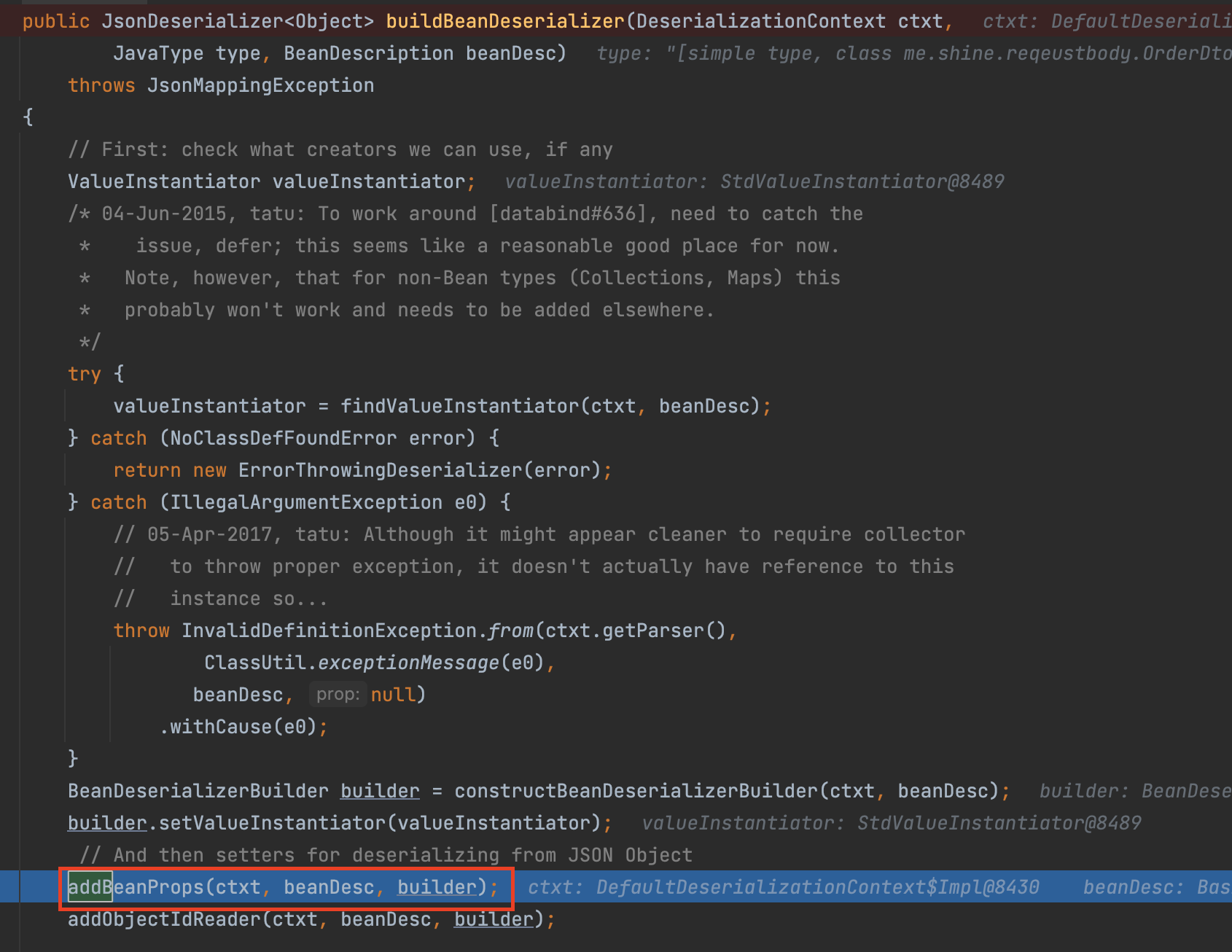 위 코드는 역직렬화를 하는 BeanDeserializer를 생성하기 위해 BeanDeserializerFactory에서 해당 작업을 수행하는 것을 확인할 수 있었습니다.
