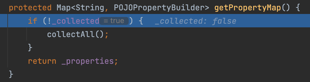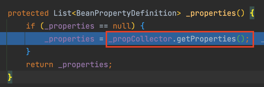 아직 properties 들이 생성되지 않은 null 의 상황이기 때문에 POJOPropertiesCollector의 getProperties()를 호출하게 됩니다.