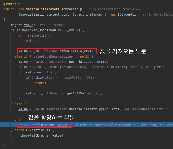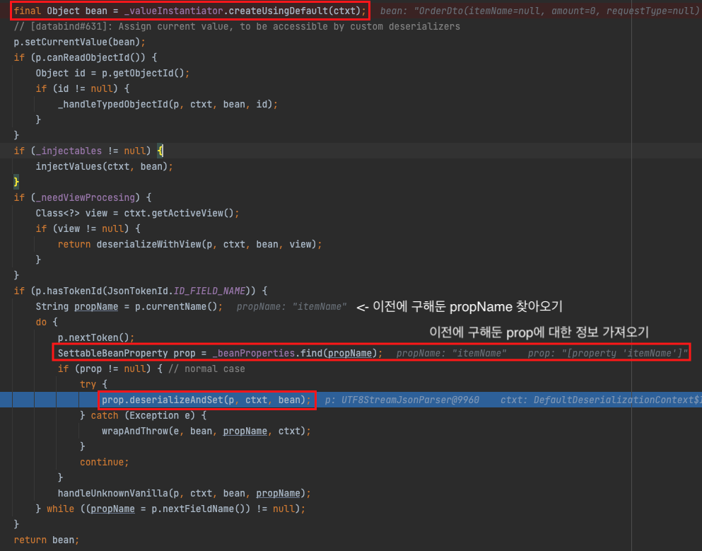 그리고 이제 JsonParser와 Bean을 deserializeAndSet 메서드로 넘겨 값을 저장해주는 것입니다.
