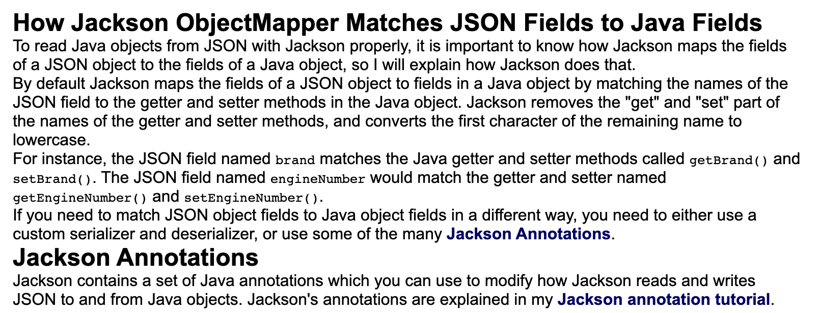 이를 요약하면 기본적으로 Jackson은 JSON 필드의 이름을 Java 오브젝트의 getter 및 setter 메소드와 일치시켜 JSON 오브젝트의 필드를 Java 오브젝트의 필드에 주입시키게 됩니다.