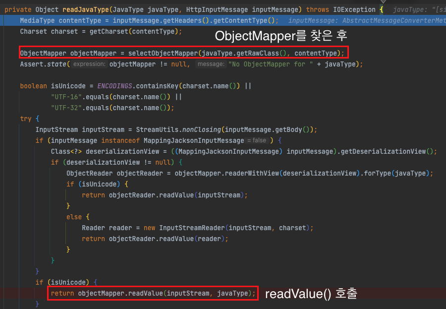 컨버터 내부에서 ObjectMapper를 생성 한 후, readValue()를 호출하게 됩니다.