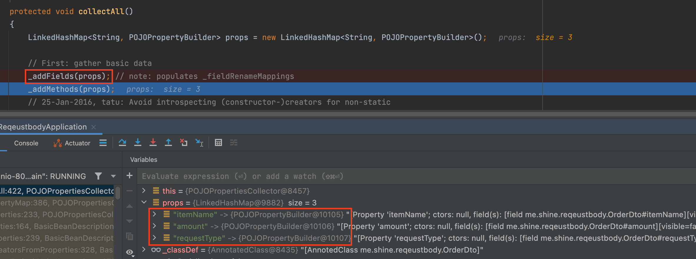 이후 이전에 위에서 봤던 collectAll() 매서드로 돌아와 보면 props에 field에 대한 정보들이 담겨있는것을 확인할 수 있게 되었다.