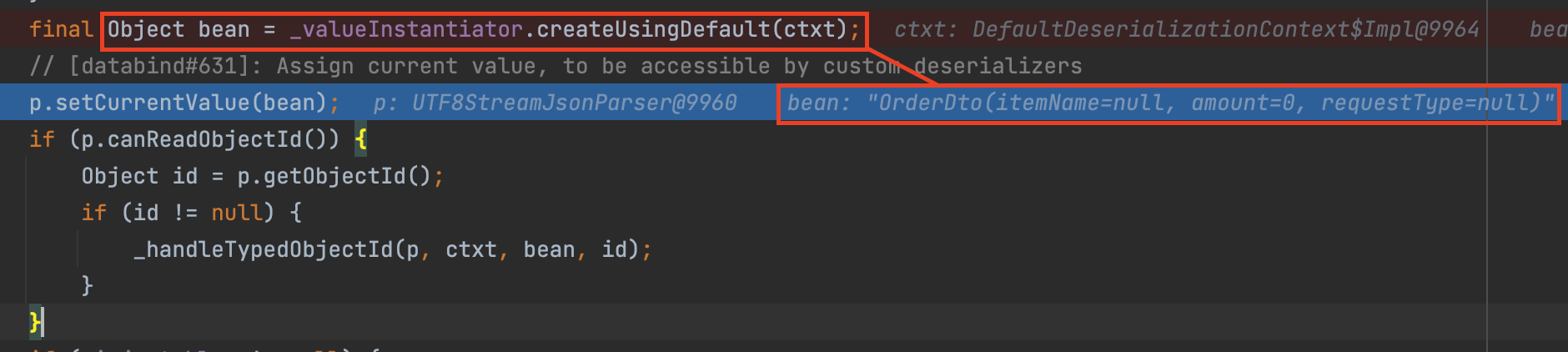 deserializerFromObject 내부에서 default 생성자로 객체를 생성 한 후의 모습니다.