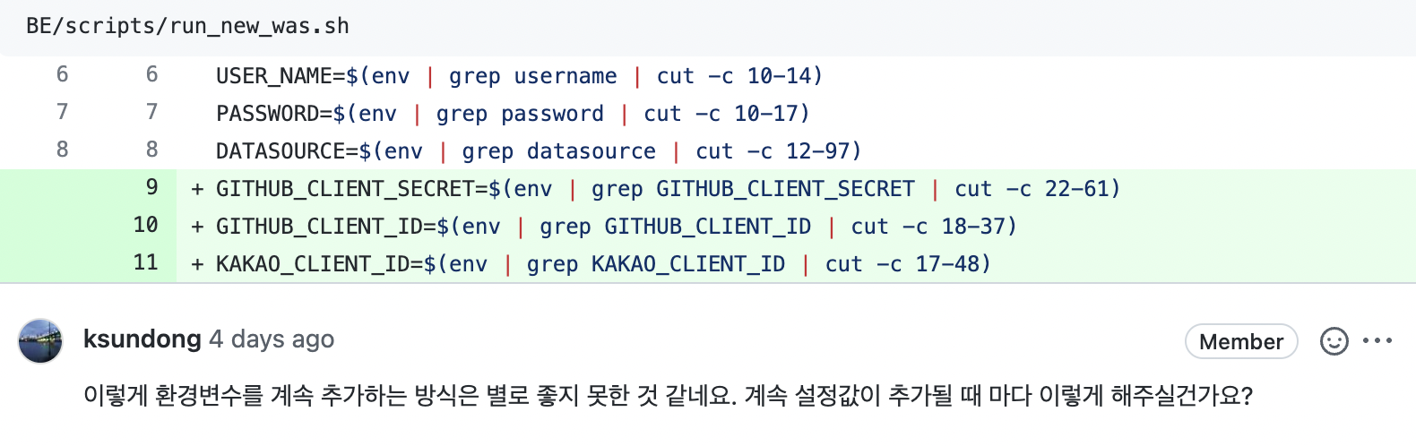 맨 처음 환경변수로 등록해둔 값들을 grep 과 cut을 통해 변수로 받는 과정이 있습니다.