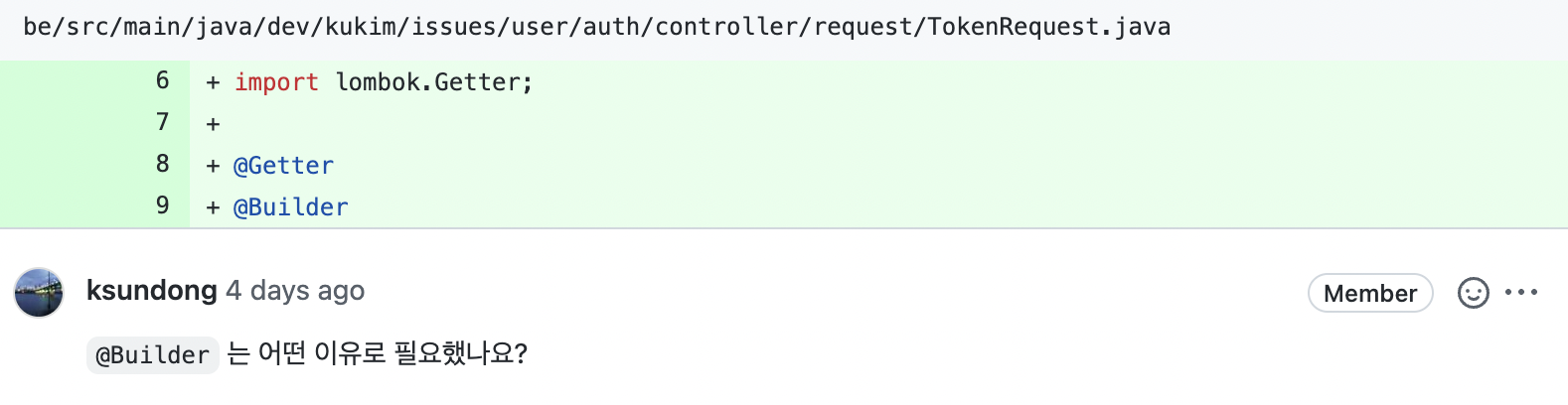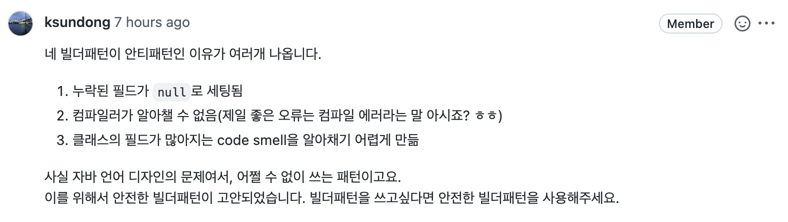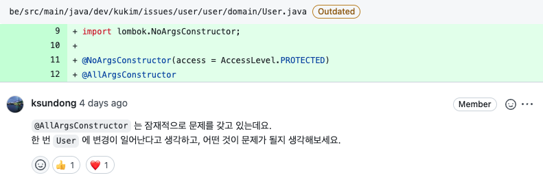 필드가 많아지는 것을 원래 생성자를 사용할때는 금방금방 인식이 되는데, 위와같이 롬복 + 빌더를 사용하면 인식하기 힘든 부분인것 같다.