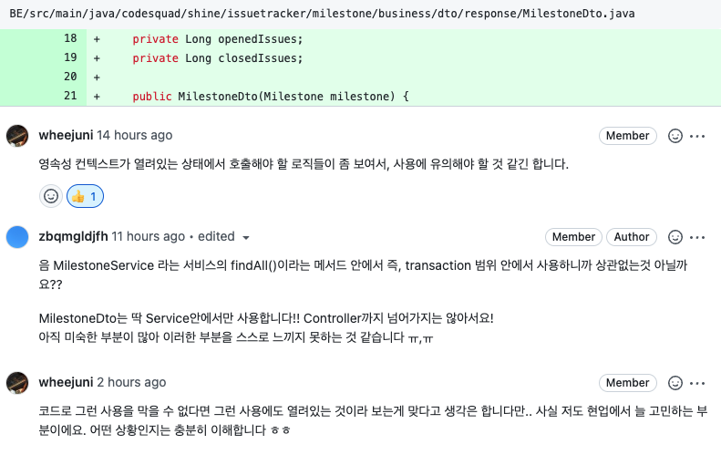 안녕하세요! Shine 입니다! 우선 저의 리뷰를 담당해주시게 되어 감사하다는 말씀 먼저 전하게 됩니다. 질문 2가지 1. DTO 디렉토리의 위치 DTO를 controller → service 로 넘길때도 사용하고, service → con