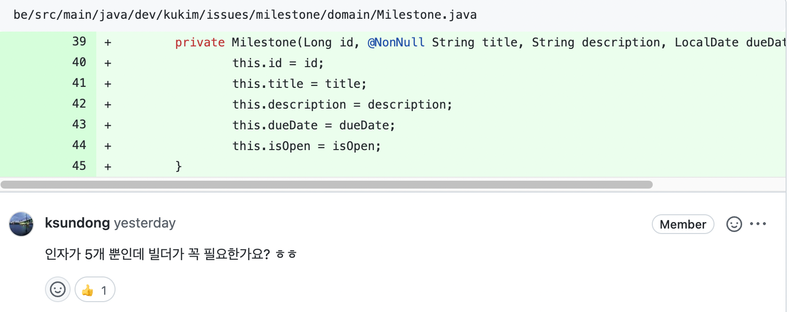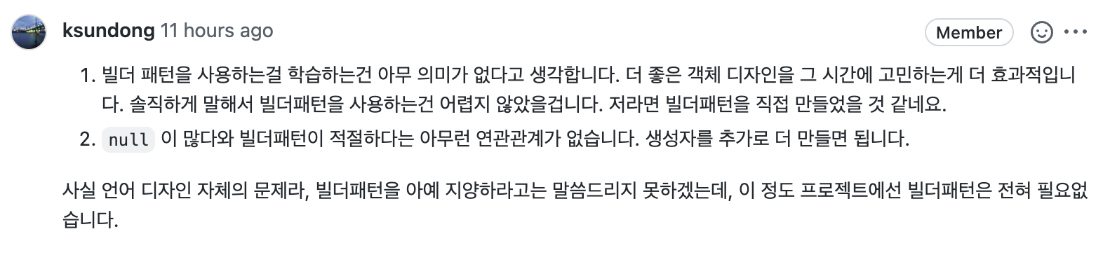사실 나도 Builder를 즐겨 쓰기는 했는데, 한번쯤 고민해볼 문제인것 같다.