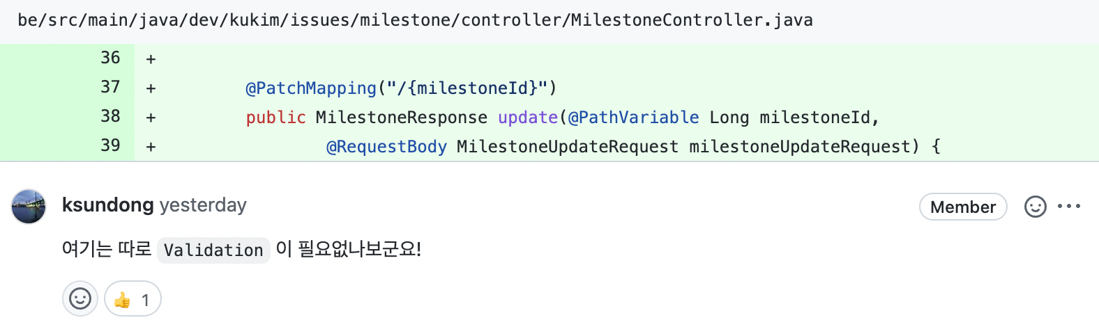 - 컨트롤러에서만 한다. (객체라면 @Valid, 위 경우 milestoneId가 음수인지 체크를 컨트롤러에서 한다. )