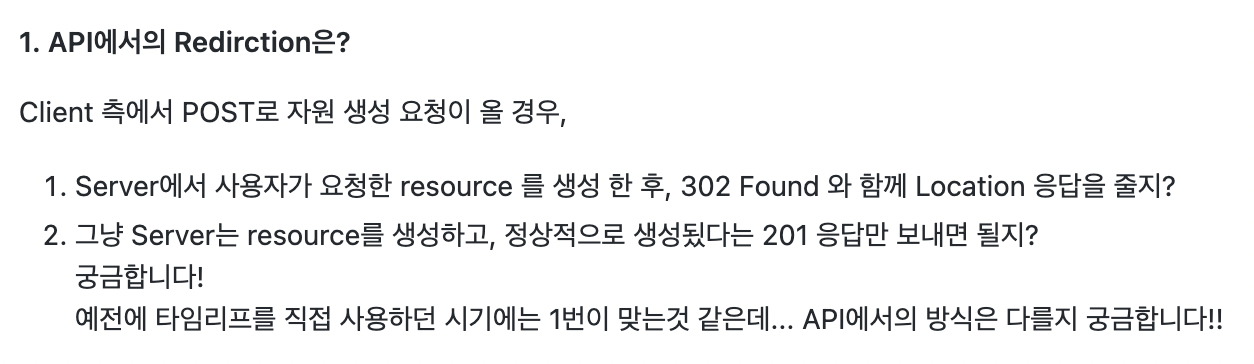 안녕하세요! Shine 입니다! 저의 리뷰를 담당해주시게 되어 감사하다는 말씀 전하고 싶습니다. 질문 1가지 1. API에서의 Redirction은? Client 측에서 POST로 자원 생성 요청이 올 경우, Server에서 사용자가