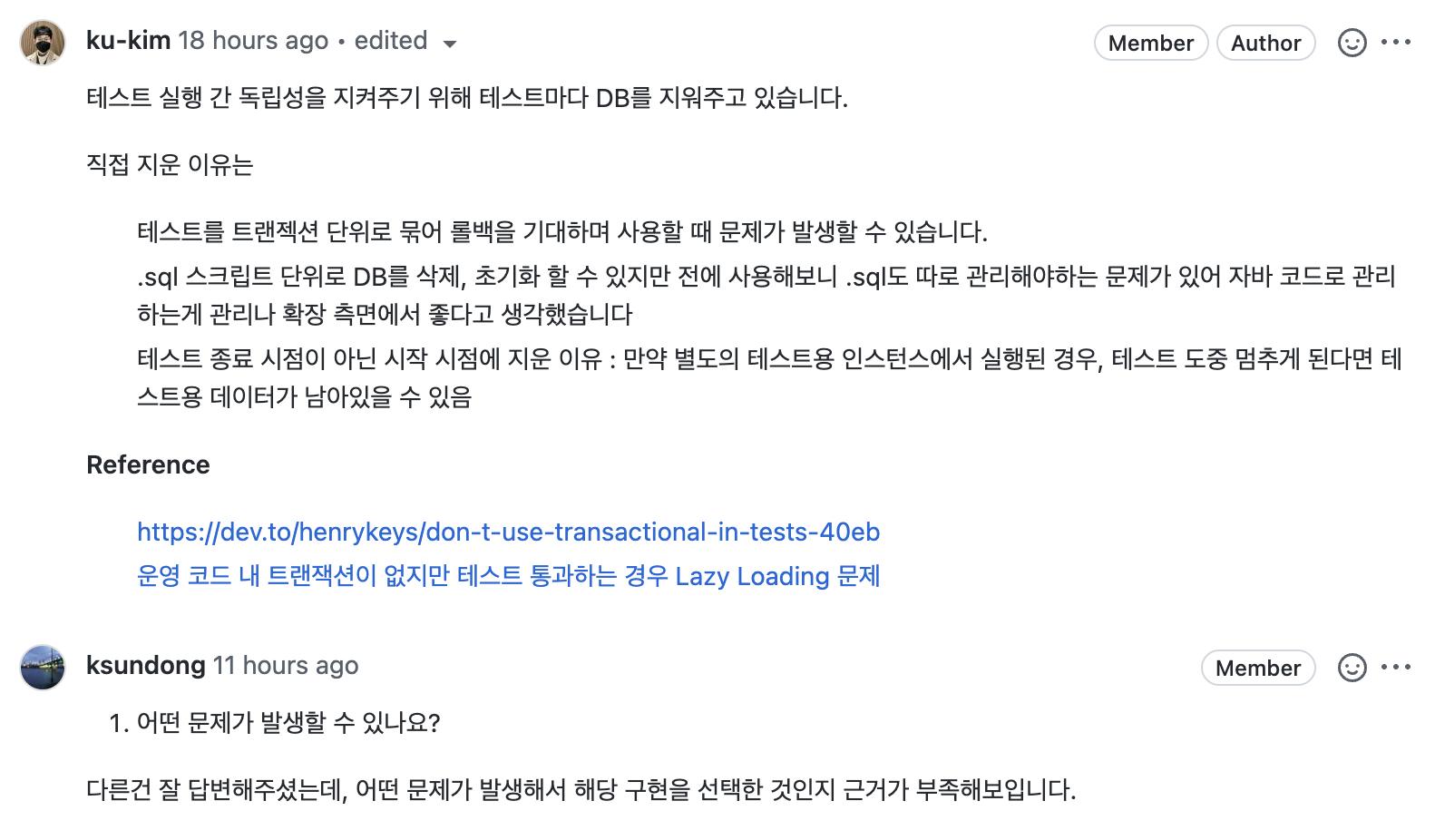 이러한 문제를 막기 위해 애당초 test 코드에서도 @Transactional을 없에서 Test코드에서도 일괄적으로 에러가 발생하게 만드는 것 이다.