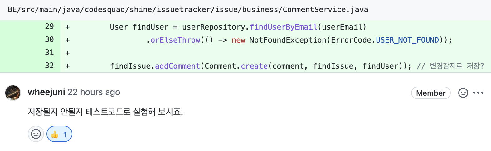 따라서 부모인 Issue를 불러와 comment를 add해주면 변경감지로 인하여 Transaction이 끝날 시점에 flush가 되어 저장될것이라는 것이 나의 생각이였다.