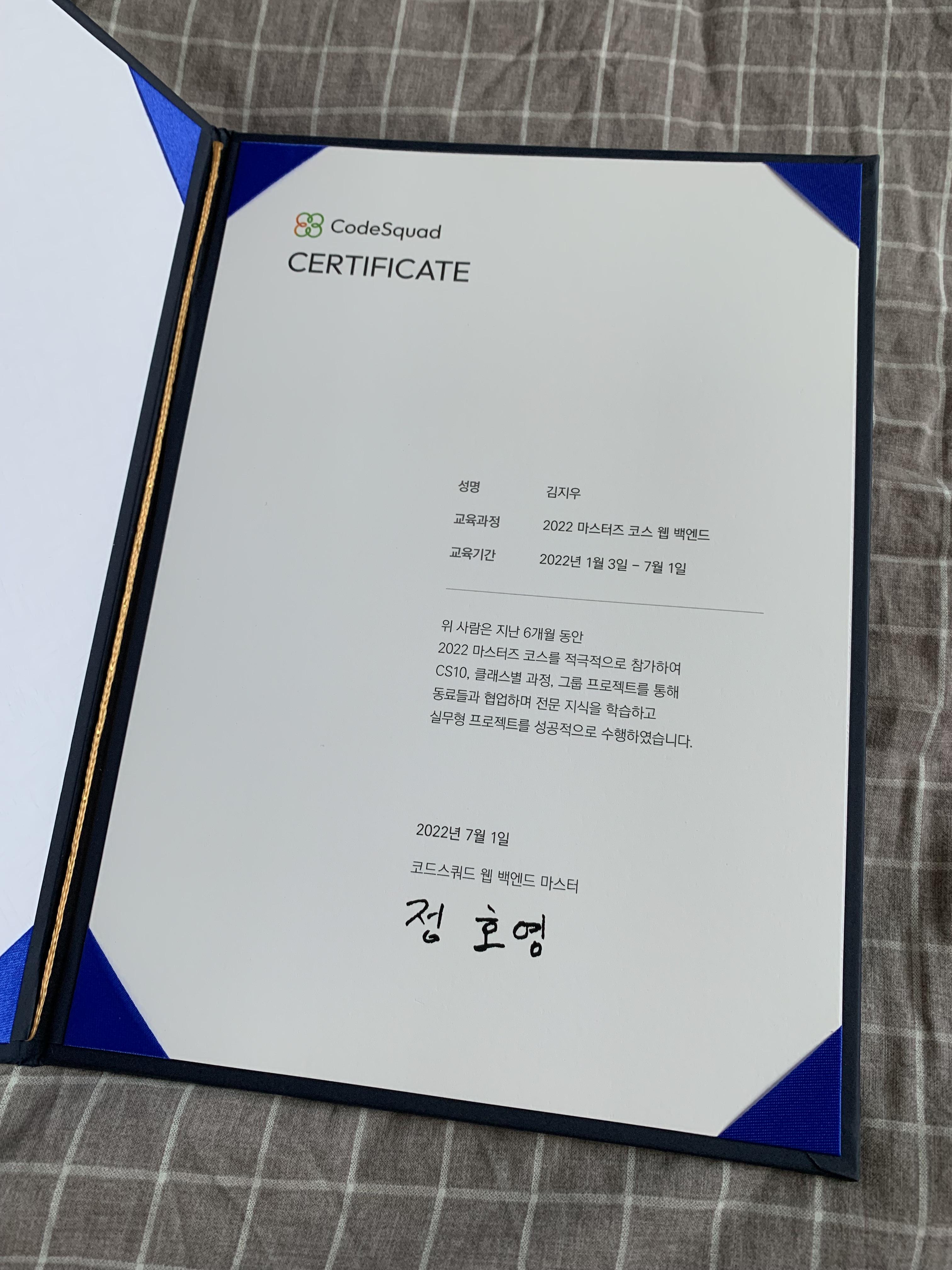 2022년 1월 1일. 부트캠프 코드스쿼드에 참여하여 공부하던 게 엊그제 같은데... 어느덧 6개월이 지나 코드스쿼드 과정은 7월 1일부로 마무리했고 수료식도 했다.
