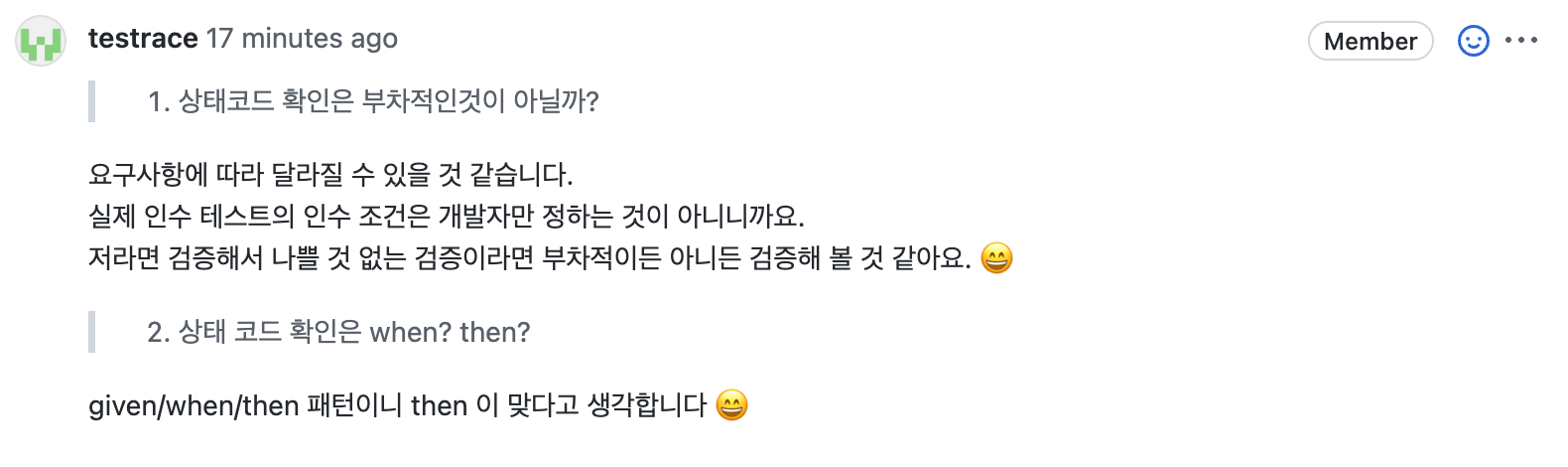 어떠 한 사건이 일어났을때(when) 결과가 어떠해야 한다(then)에서, when에서 상태코드를 확인하는 것은 부차적인 일 아닐까? 란 생각을 했는데, 검증하는 쪽이 더 좋은 방향인것 이겠죠?