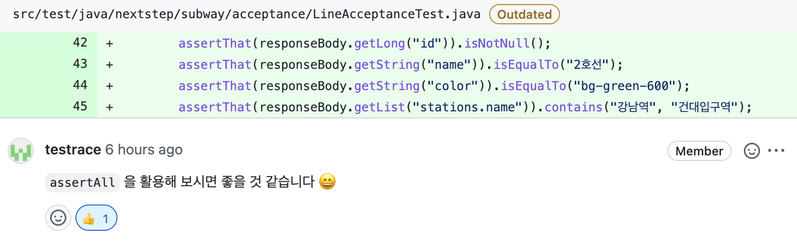 이러한 단점을 극복한 assertAll을 사용하도록 변경하였다.