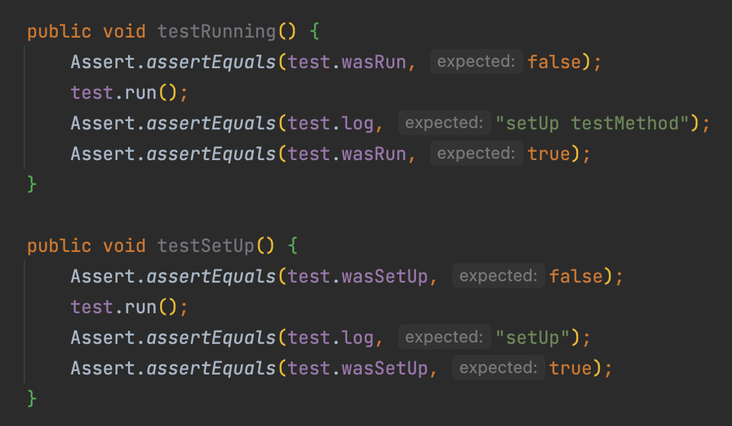이렇게 하면 setUp 과 testMethod의 실행과 순서 확인을 log라는 필드를 통해 검증하도록 Refactoring 한 것이다.