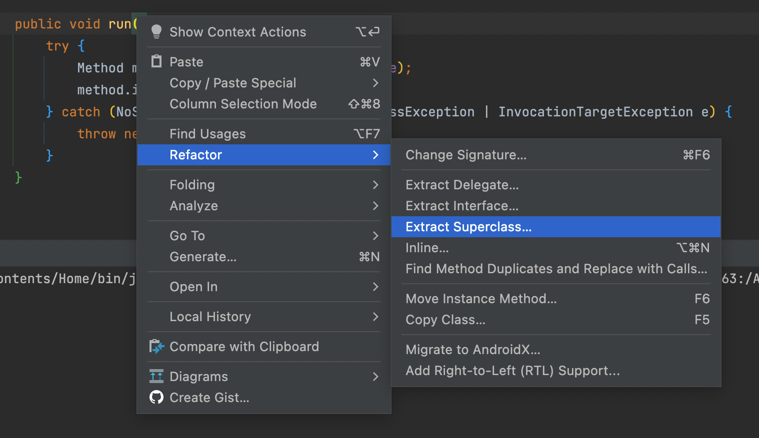 run 메서드 이름에다가 우클릭을 하여, Refactor -> Extract Superclass를 통해 추출합시다.