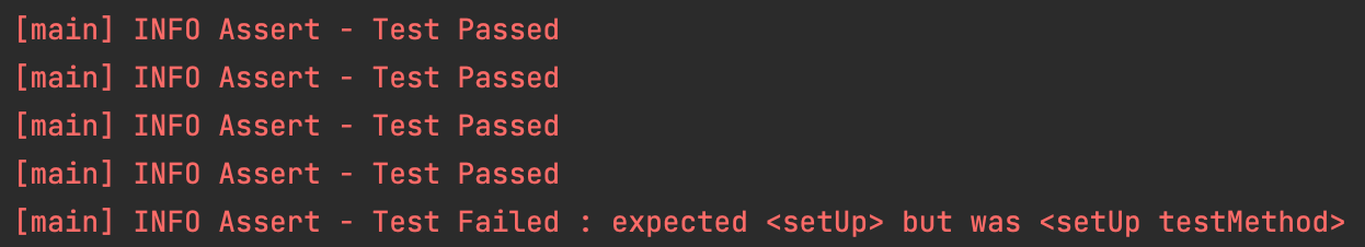 -> log가 "setUp testMethod"이기 때문에 테스트는 실패한다. 기대하는 값은 "setUp"이다.