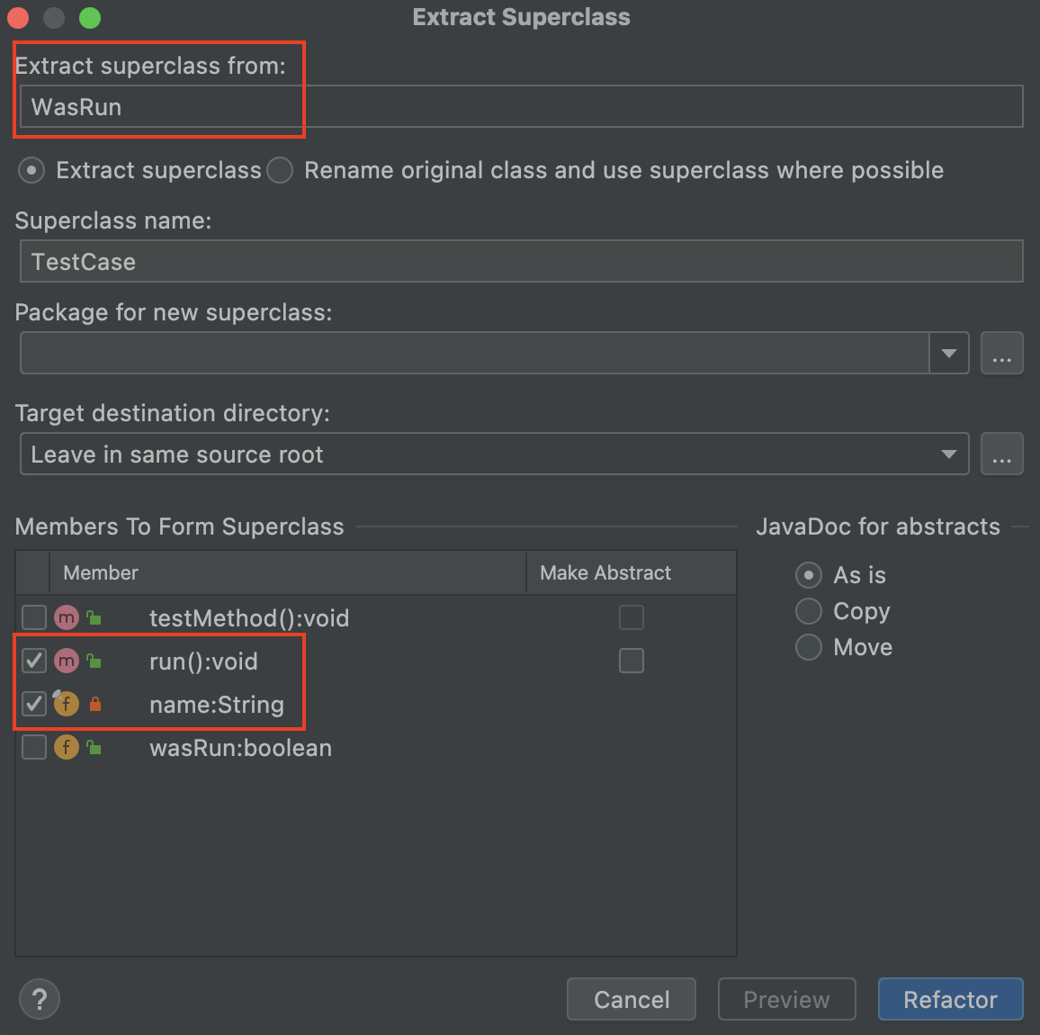 이후 다음과 같이 name, run을 추출해 줍시다. Superclass의 이름으로는 TestCase를 지정해줬습니다.