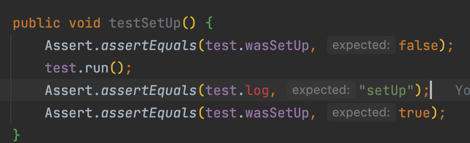 Assert.assertEquals(test.log, "setUp testMethod"); // 이부분 변경