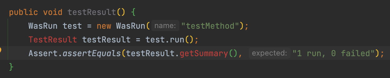 }이후 테스트를 실행시키면 실패하게 됩니다. 우리의 TestResult()에 ""(빈 문자열)이 저장되어 있기 때문이죠!