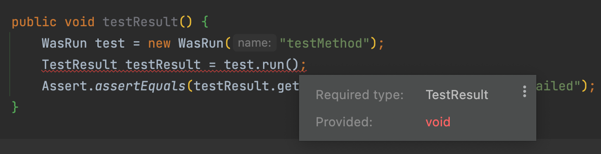 test의 run 메서드는 void를 반환하기 때문이죠! 이를 TestResult를 반환하도록 변경해 줍시다.