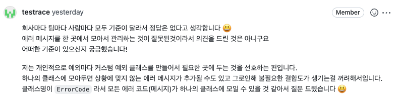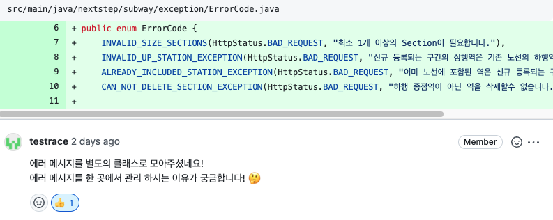 리뷰어의 의견처럼 Custom Exception마다 별도의 ErrorCode를 만들면 좋을 것 같다!! 다음 과제에서 적극 수용할 예정이다.