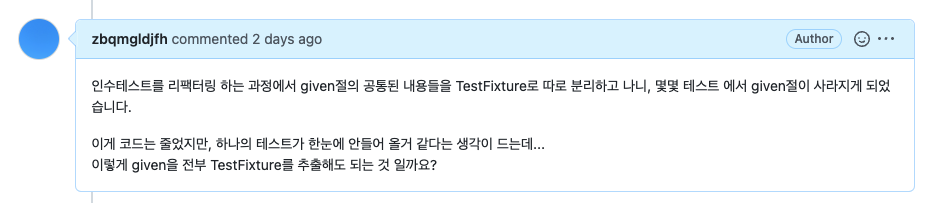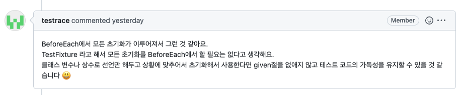그렇다! 꼭 모든 초기화를 @BeforeEach에 몰아서 코드의 행 수를 줄여야 한다는 강박에 있을 필요는 없는 것 같다.