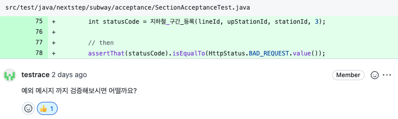 일단 다음 구현 때는 리뷰어의 의견을 수용하여 예외 메시지를 반환하도록 변경해볼 예정이다.