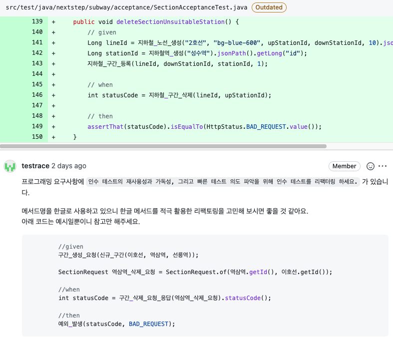 지난번 step2 에서는 이를 해결하기 위해 TestFixture를 자신의 내부에 가지고 있는 "2호선_생성()"과 같은 메서드를 만들 수 있었지만, 따라서 중복된 upStationId, downStationId 인자 전달을 막을 수 있었죠!