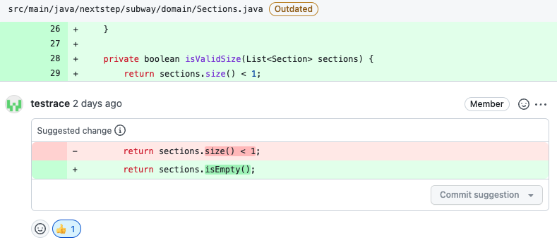 size()가 1보다 작아야 한다는 조건에 부합하는지 확인하는 메서드인데, 사실 sections의 isEmpty()를 호출하면 됐을 문제였다.