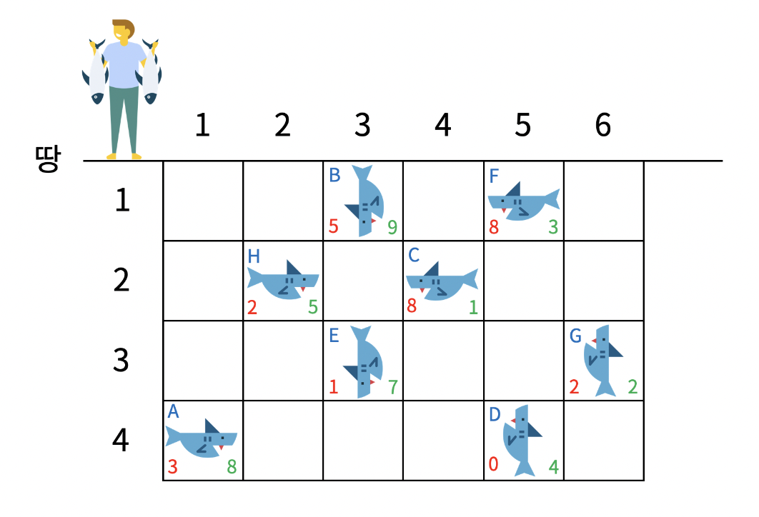 낚시왕이 상어 낚시를 하는 곳은 크기가 R×C인 격자판으로 나타낼 수 있다. 격자판의 각 칸은 (r, c)로 나타낼 수 있다. r은 행, c는 열이고, (R, C)는 아래 그림에서 가장 오른쪽 아래에 있는 칸이다.